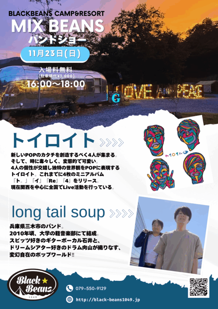 EVENT イベント トップページINFORMATIONEVENT2025年11月23日(日)バンドショー 2025年11月23日(日)バンドショー 2025-10-19 11月23日(日)16:00-18:00 BLACK BEANSキャンプ場にてバンドショーを開催! 秋の夕暮れ、焚き火の香りと共に心地良い音楽を。自然の中でゆったりうっとりとした時間をお楽しみ下さい! 【入場料】無料 別途駐車代金 ¥1.000 前へ一覧へ戻る次へ