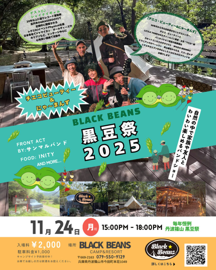 EVENT イベント トップページINFORMATIONEVENT2025年11月24日(月祝)黒豆祭バンドショー 2025年11月24日(月祝)黒豆祭バンドショー 2025-10-19 11月24日(月祝)15:00-18:00 BLACK BEANSキャンプ場にて黒豆祭バンドショーを開催! 90年代から活躍し今なお色褪せないレゲエシンガー、チエコビューティーと多彩な才能溢れるバンド、にゃ〜まんずがBLACK BEANSに登場します♪ 秋の夕暮れ、心地良いレゲエの音楽を。自然の中でゆったりうっとりとした時間をお楽しみ下さい! 【入場料】¥2.000 別途駐車代金 ¥1.000 前へ一覧へ戻る